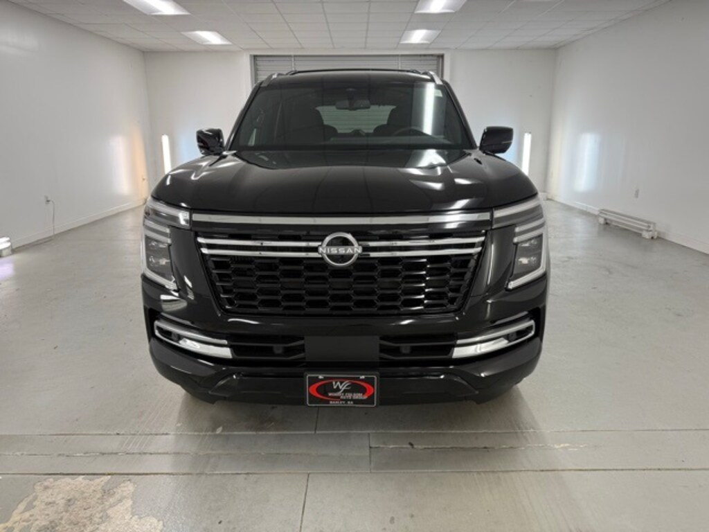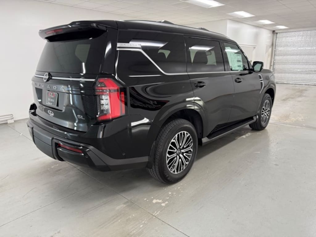 Super Black 2025 Nissan Armada SL 4WD 9-Speed Automatic 3.5L DOHC 4WD, 12 Speakers, 20" Painted Alloy Wheels, 2nd Row Center Console w/2 Cupholders, 2nd Row Outboard Captain's Chairs w/Armrests, 3rd row seats: split-bench, 4-Wheel Disc Brakes, ABS brakes, Air Conditioning, Alloy wheels, AM/FM radio: SiriusXM, Anti-whiplash front head restraints, Auto High-beam Headlights, Auto tilt-away steering wheel, Auto-dimming door mirrors, Auto-dimming Rear-View mirror, Auto-leveling suspension, Automatic temperature control, Brake assist, Bumpers: body-color, Captain's Chair Seat Package, Carpeted Floor Mats - Captain Chairs, Center Front Spoiler, Delay-off headlights, Driver door bin, Driver vanity mirror, Dual front impact airbags, Dual front side impact airbags, Electronic Stability Control, Emergency communication system: NissanConnect Services, EZ Flex 2nd-Row Seating System w/1-Touch Release, Four wheel independent suspension, Front anti-roll bar, Front Bucket Seats, Front Center Armrest, Front dual zone A/C, Front reading lights, Fully automatic headlights, Garage door transmitter: myQ Connected Garage, Genuine wood dashboard insert, Heated door mirrors, Heated Front Bucket Seats, Heated front seats, Heated steering wheel, HVAC memory, Illuminated entry, Knee airbag, Leather steering wheel, Low tire pressure warning, Memory seat, Navigation System, Occupant sensing airbag, Outside temperature display, Overhead airbag, Overhead console, Panic alarm, Passenger door bin, Passenger vanity mirror, Power door mirrors, Power driver seat, Power Liftgate, Power passenger seat, Power steering, Power windows, Radio: NissanConnect w/SiriusXM 360L, Rain sensing wipers, Rear air conditioning, Rear anti-roll bar, Rear reading lights, Rear seat center armrest, Rear window defroster, Rear window wiper, Reclining 3rd row seat, Remote keyless entry, Roof Rail Cross Bars, Security system, Speed control, Speed-sensing steering, Speed-Sensitive Wipers, Splash Guards, Split folding rear seat, Spoiler, Steering wheel memory, Steering wheel mounted audio controls, Tachometer, TailorFit Seat Trim, Telescoping steering wheel, Tilt steering wheel, Traction control, Trip computer, Turn signal indicator mirrors, Variably intermittent wipers, Voltmeter, 4WD.