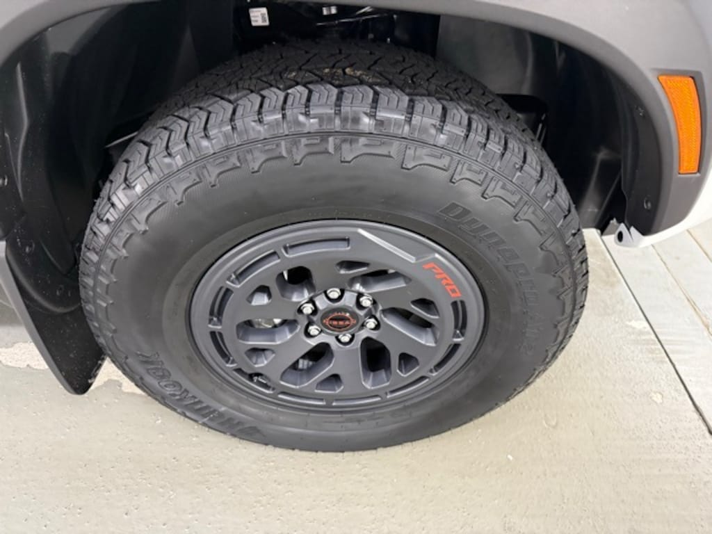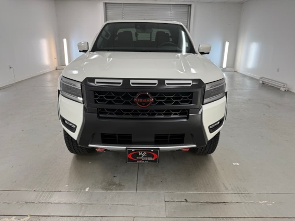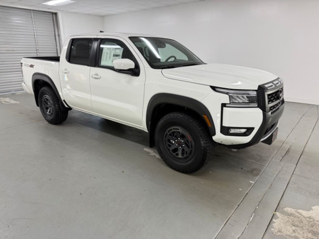 Glacier White 2025 Nissan Frontier PRO-4X 4WD 9-Speed Automatic with Overdrive 3.8L DI DOHC 24V V6 4WD, 17" Painted Alloy Wheels, 3.692 Axle Ratio, 4-Wheel Disc Brakes, 6 Speakers, ABS brakes, Air Conditioning, Alloy wheels, AM/FM radio: SiriusXM, Anti-whiplash front head restraints, Auto High-beam Headlights, Automatic temperature control, Blind Spot Warning, Brake assist, Bumpers: body-color, Delay-off headlights, Driver door bin, Driver vanity mirror, Dual front impact airbags, Dual front side impact airbags, Electronic Stability Control, Emergency communication system, Front anti-roll bar, Front Bucket Seats, Front Center Armrest, Front dual zone A/C, Front fog lights, Front reading lights, Front wheel independent suspension, Fully automatic headlights, Illuminated entry, Knee airbag, Leather Shift Knob, Leather steering wheel, Low tire pressure warning, Occupant sensing airbag, Overhead airbag, Overhead console, Panic alarm, Passenger door bin, Passenger vanity mirror, Power door mirrors, Power driver seat, Power passenger seat, Power steering, Power windows, PRO Embroidered Premium Cloth Seat Trim, Radio data system, Radio: SXM/AM/FM/AUX/USB Audio System, Rear anti-roll bar, Rear seat center armrest, Rear side impact airbag, Rear step bumper, Remote keyless entry, Security system, Speed control, Speed-sensing steering, Split folding rear seat, Steering wheel mounted audio controls, Tachometer, Telescoping steering wheel, Tilt steering wheel, Traction control, Trip computer, Variably intermittent wipers, Voltmeter, Wireless Apple CarPlay/Wireless Android Auto, 4WD. Price includes: $3500 - Nissan Customer Cash. Exp. 11/03/2025 $500 - Nissan MY25 Frontier Selldown Bonus Cash (PRO Trims). Exp. 11/03/2025