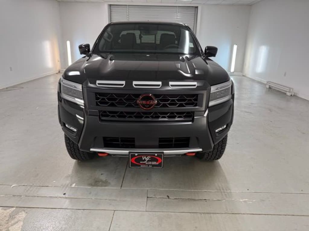Super Black 2025 Nissan Frontier PRO-4X 4WD 9-Speed Automatic with Overdrive 3.8L DI DOHC 24V V6 4WD, 17" Painted Alloy Wheels, 3.692 Axle Ratio, 4-Wheel Disc Brakes, 6 Speakers, ABS brakes, Air Conditioning, Alloy wheels, AM/FM radio: SiriusXM, Antenna Update, Anti-whiplash front head restraints, Auto High-beam Headlights, Auto-Dimming Mirror, Auto-Tilt & Slide Sunroof w/Manual Shade, Automatic temperature control, Bed Under-Rail Lighting, Blind Spot Warning, Brake assist, Bumpers: body-color, Delay-off headlights, Driver door bin, Driver vanity mirror, Dual front impact airbags, Dual front side impact airbags, Electronic Stability Control, Electronic Tailgate Lock, Emergency communication system, Essentials Kit, Fender Premium Audio System w/10 Speakers, Front anti-roll bar, Front Bucket Seats, Front Center Armrest, Front dual zone A/C, Front fog lights, Front reading lights, Front wheel independent suspension, Fully automatic headlights, Heated Front Seats, Heated Outside Mirrors, Heated Steering Wheel, HomeLink UGDO, Illuminated entry, Intelligent Around View Monitor (I-AVM), Knee airbag, Leather Seat Trim, Leather Shift Knob, Leather steering wheel, Low tire pressure warning, Mud Flap Accessory, Nissan Door-to-Door Navigation, Occupant sensing airbag, Overhead airbag, Overhead console, Panic alarm, Partial Under-Seat Storage Delete, Passenger door bin, Passenger vanity mirror, Power door mirrors, Power driver seat, Power passenger seat, Power steering, Power windows, PRO Convenience Package, PRO Embroidered Premium Cloth Seat Trim, PRO Premium Package, PRO-4X Carpeted Floor Mats (DISC), Radio data system, Radio: SXM/AM/FM/AUX/USB Audio System, Rear anti-roll bar, Rear seat center armrest, Rear side impact airbag, Rear step bumper, Remote keyless entry, Security system, Speed control, Speed-sensing steering, Split folding rear seat, Spray-In Bedliner, Steering wheel mounted audio controls, Tachometer, Telescoping steering wheel, Tilt steering wheel, Tow Package (T11) (DISC), Traction control, Traffic Sign Recognition (TSR), Trailer Hitch w/Wiring Harness, Trip computer, Variably intermittent wipers, Voltmeter, Wireless Apple CarPlay/Wireless Android Auto, Wireless Charging for Personal Devices, 4WD.