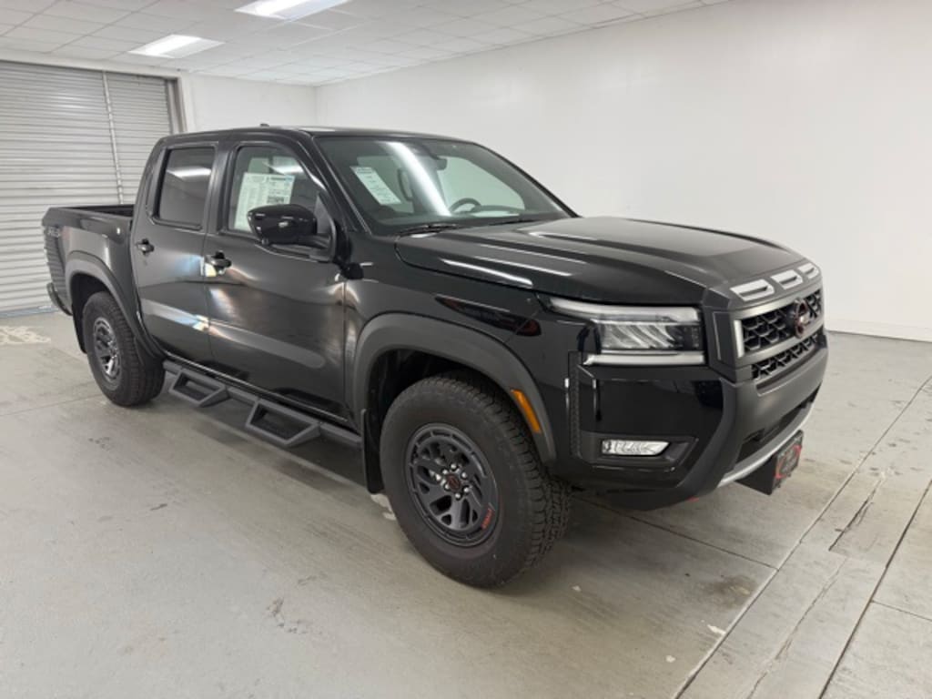 Super Black 2025 Nissan Frontier PRO-4X 4WD 9-Speed Automatic with Overdrive 3.8L DI DOHC 24V V6 4WD, 120V Power Outlet in Bed, 120V Power Outlet in Rear Center Console, 17" Painted Alloy Wheels, 3.692 Axle Ratio, 4-Wheel Disc Brakes, 6 Speakers, ABS brakes, Air Conditioning, Alloy wheels, AM/FM radio: SiriusXM, Antenna Update, Anti-whiplash front head restraints, Auto High-beam Headlights, Auto-Dimming Mirror, Auto-Tilt & Slide Sunroof w/Manual Shade, Automatic temperature control, Bed Under-Rail Lighting, Blind Spot Warning, Brake assist, Bumpers: body-color, Delay-off headlights, Driver door bin, Driver vanity mirror, Dual front impact airbags, Dual front side impact airbags, Electronic Stability Control, Electronic Tailgate Lock, Emergency communication system, Essentials Kit, Fender Premium Audio System w/10 Speakers, Front anti-roll bar, Front Bucket Seats, Front Center Armrest, Front dual zone A/C, Front fog lights, Front reading lights, Front wheel independent suspension, Fully automatic headlights, Heated Front Seats, Heated Outside Mirrors, Heated Steering Wheel, HomeLink UGDO, Illuminated entry, Intelligent Around View Monitor (I-AVM), Knee airbag, Leather Seat Trim, Leather Shift Knob, Leather steering wheel, Low tire pressure warning, Mud Flap Accessory, Nissan Door-to-Door Navigation, Occupant sensing airbag, Off-Road Style Step Rails, Overhead airbag, Overhead console, Panic alarm, Partial Under-Seat Storage Delete, Passenger door bin, Passenger vanity mirror, Power door mirrors, Power driver seat, Power passenger seat, Power steering, Power windows, PRO Convenience Package, PRO Embroidered Premium Cloth Seat Trim, PRO Premium Package, PRO-4X Carpeted Floor Mats (DISC), Radio data system, Radio: SXM/AM/FM/AUX/USB Audio System, Rear anti-roll bar, Rear seat center armrest, Rear side impact airbag, Rear step bumper, Remote Engine Starter, Remote keyless entry, Security system, Speed control, Speed-sensing steering, Split folding rear seat, Spray-In Bedliner, Steering wheel mounted audio controls, Tachometer, Telescoping steering wheel, Tilt steering wheel, Tow Package (T11) (DISC), Traction control, Traffic Sign Recognition (TSR), Trailer Hitch w/Wiring Harness, Trip computer, USB Charging Cable Kit, Utili-Track System, Variably intermittent wipers, Voltmeter, Wireless Apple CarPlay/Wireless Android Auto, Wireless Charging for Personal Devices, 4WD.