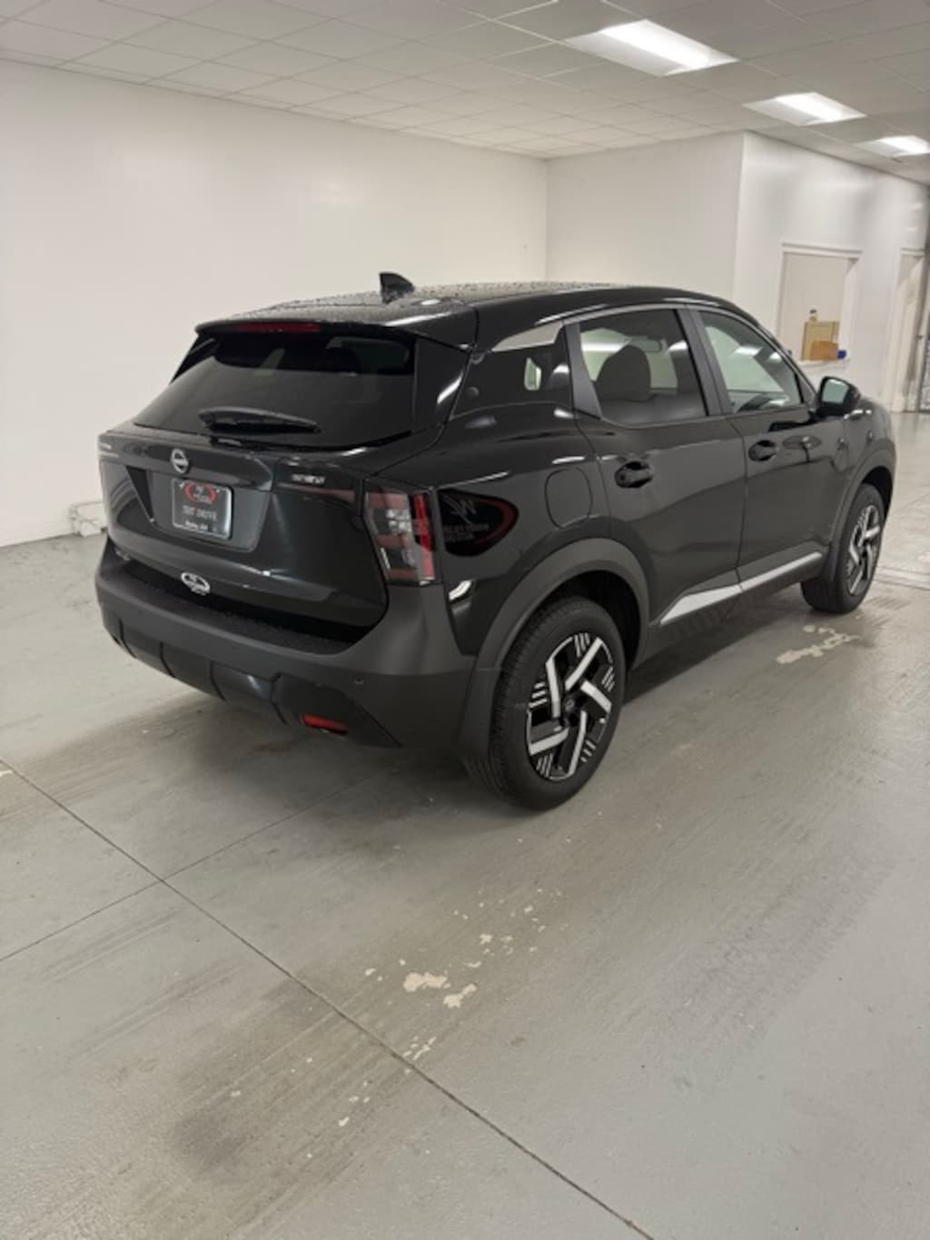 Super Black 2025 Nissan Kicks SV FWD CVT with Xtronic 2.0L DOHC 4 Speakers, 4-Wheel Disc Brakes, ABS brakes, Air Conditioning, AM/FM radio: Sirius, Auto High-beam Headlights, Blind Spot Warning, Brake assist, Bumpers: body-color, Cloth Seat Trim, Driver door bin, Driver vanity mirror, Dual front impact airbags, Dual front side impact airbags, Electronic Stability Control, Front anti-roll bar, Front Bucket Seats, Front Center Armrest, Front reading lights, Front wheel independent suspension, Fully automatic headlights, Illuminated entry, Knee airbag, Low tire pressure warning, Occupant sensing airbag, Outside temperature display, Overhead airbag, Panic alarm, Passenger door bin, Passenger vanity mirror, Power door mirrors, Power steering, Power windows, Radio data system, Radio: AM/FM Audio System, Rear anti-roll bar, Rear Parking Sensors, Rear reading lights, Rear side impact airbag, Rear window defroster, Rear window wiper, Remote keyless entry, Security system, Speed control, Speed-sensing steering, Split folding rear seat, Spoiler, Sport steering wheel, Steering wheel mounted audio controls, Tachometer, Telescoping steering wheel, Tilt steering wheel, Traction control, Trip computer, Variably intermittent wipers, Wheels: 17" Steel Flex w/Full Covers, Wireless Apple CarPlay/Wireless Android Auto.
