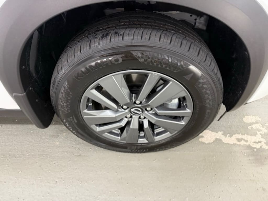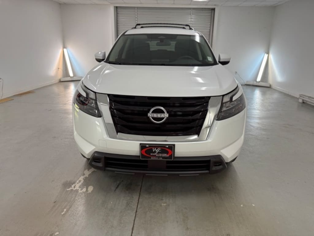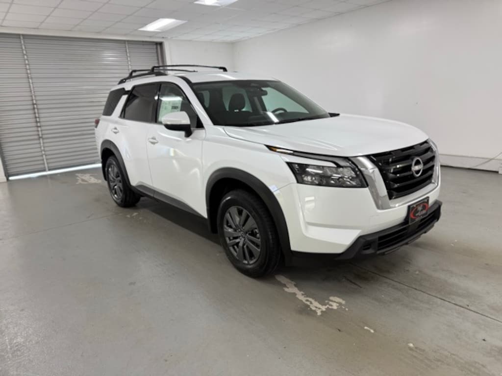White Pearl 2025 Nissan Pathfinder SV FWD 9-Speed Automatic 3.5L V6 DOHC 3rd row seats: bench, 4-Wheel Disc Brakes, 6 Speakers, ABS brakes, Air Conditioning, Alloy wheels, AM/FM radio: SiriusXM, Auto High-beam Headlights, Automatic temperature control, Brake assist, Bumpers: body-color, Cloth Seating Surfaces, Delay-off headlights, Driver door bin, Driver vanity mirror, Dual front impact airbags, Dual front side impact airbags, Electronic Stability Control, Emergency communication system, Four wheel independent suspension, Front anti-roll bar, Front Bucket Seats, Front Center Armrest, Front dual zone A/C, Front reading lights, Fully automatic headlights, Heated door mirrors, Heated Front Bucket Seats, Heated front seats, Illuminated entry, Knee airbag, Leather steering wheel, Low tire pressure warning, NissanConnect featuring Apple CarPlay and Android Auto, Occupant sensing airbag, Outside temperature display, Overhead airbag, Overhead console, Panic alarm, Passenger door bin, Passenger vanity mirror, Power door mirrors, Power driver seat, Power Liftgate, Power steering, Power windows, Radio data system, Radio: AM/FM Audio System w/NissanConnect, Rear air conditioning, Rear anti-roll bar, Rear Parking Sensors, Rear reading lights, Rear seat center armrest, Rear side impact airbag, Rear window defroster, Rear window wiper, Reclining 3rd row seat, Remote keyless entry, Security system, Speed control, Speed-sensing steering, Split folding rear seat, Spoiler, Steering wheel mounted audio controls, Tachometer, Telescoping steering wheel, Tilt steering wheel, Traction control, Trip computer, Turn signal indicator mirrors, Variably intermittent wipers, Wheels: 18" x 8J Painted Alloy.