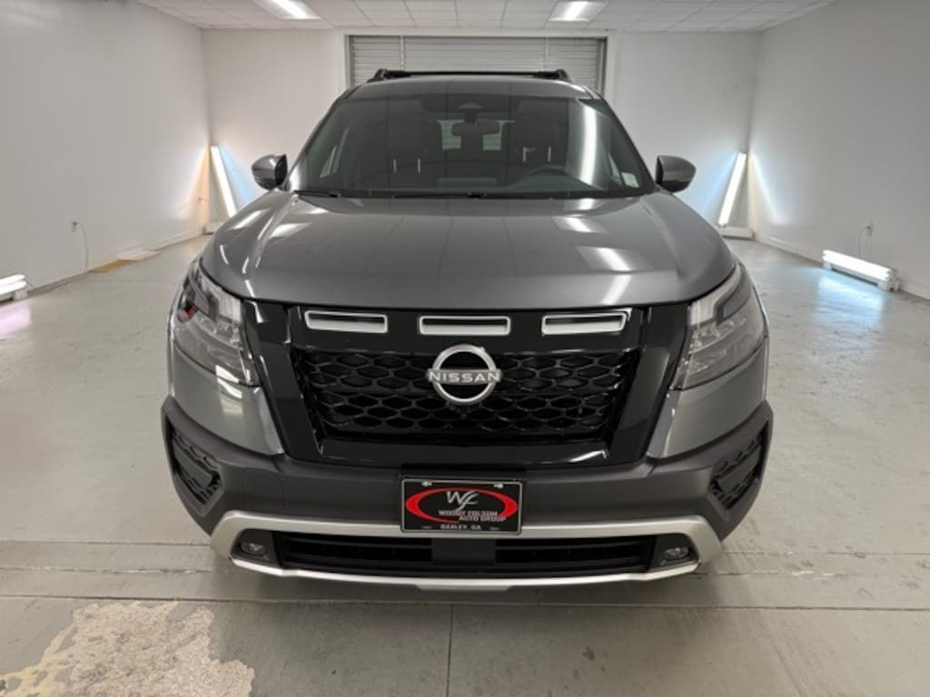 Gun Metallic 2025 Nissan Pathfinder Rock Creek 4WD 9-Speed Automatic 3.5L V6 DOHC 4WD, 3rd row seats: bench, 4-Wheel Disc Brakes, 6 Speakers, ABS brakes, Air Conditioning, Alloy wheels, AM/FM radio: SiriusXM, Auto High-beam Headlights, Automatic temperature control, Brake assist, Delay-off headlights, Driver door bin, Driver vanity mirror, Dual front impact airbags, Dual front side impact airbags, Electronic Stability Control, Emergency communication system, Four wheel independent suspension, Front anti-roll bar, Front Bucket Seats, Front Center Armrest, Front dual zone A/C, Front reading lights, Fully automatic headlights, Heated door mirrors, Heated Front Bucket Seats, Heated front seats, Illuminated entry, Knee airbag, Leather steering wheel, Low tire pressure warning, NissanConnect featuring Apple CarPlay and Android Auto, Occupant sensing airbag, Outside temperature display, Overhead airbag, Overhead console, Panic alarm, Passenger door bin, Passenger vanity mirror, Power door mirrors, Power driver seat, Power Liftgate, Power steering, Power windows, Radio data system, Radio: AM/FM Audio System w/NissanConnect, Rear air conditioning, Rear anti-roll bar, Rear Parking Sensors, Rear reading lights, Rear side impact airbag, Rear window defroster, Rear window wiper, Reclining 3rd row seat, Remote keyless entry, Security system, Speed control, Speed-sensing steering, Split folding rear seat, Spoiler, Steering wheel mounted audio controls, Tachometer, Telescoping steering wheel, Tilt steering wheel, Traction control, Trip computer, Turn signal indicator mirrors, Variably intermittent wipers, 4WD.
