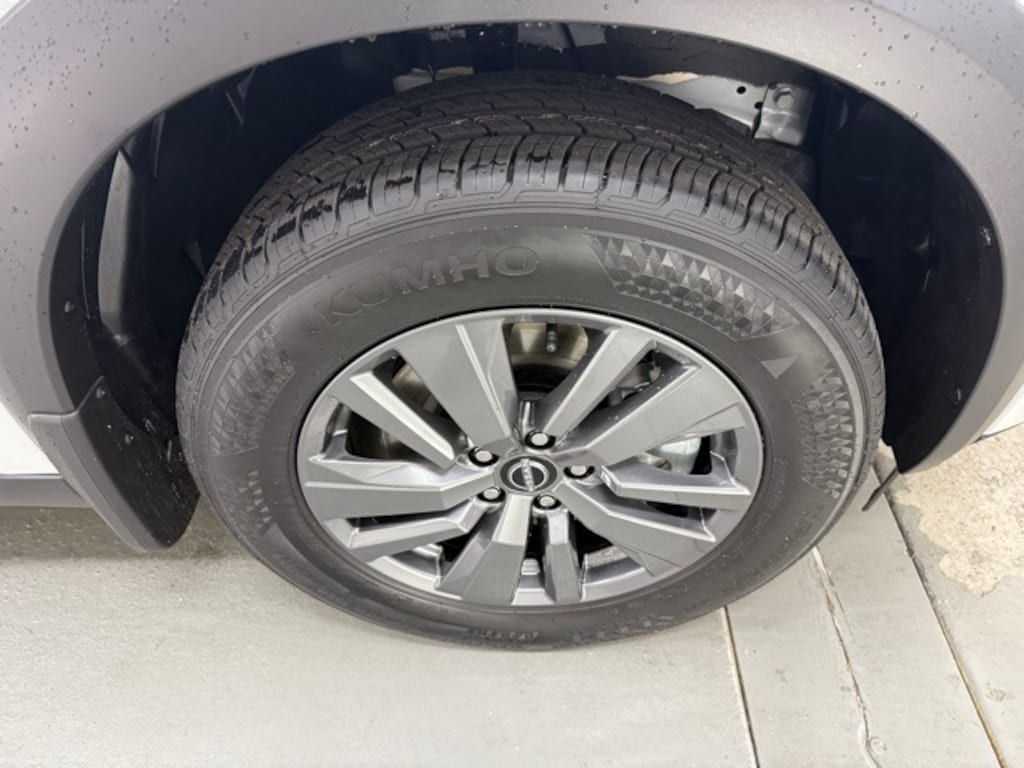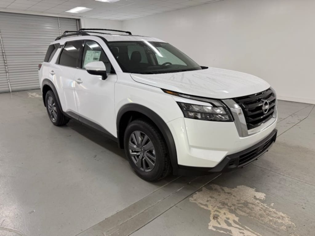 White Pearl 2025 Nissan Pathfinder SV FWD 9-Speed Automatic 3.5L V6 DOHC 3rd row seats: bench, 4-Wheel Disc Brakes, 6 Speakers, ABS brakes, Air Conditioning, Alloy wheels, AM/FM radio: SiriusXM, Auto High-beam Headlights, Automatic temperature control, Brake assist, Bumpers: body-color, Cloth Seating Surfaces, Delay-off headlights, Driver door bin, Driver vanity mirror, Dual front impact airbags, Dual front side impact airbags, Electronic Stability Control, Emergency communication system, Four wheel independent suspension, Front anti-roll bar, Front Bucket Seats, Front Center Armrest, Front dual zone A/C, Front reading lights, Fully automatic headlights, Heated door mirrors, Heated Front Bucket Seats, Heated front seats, Illuminated entry, Knee airbag, Leather steering wheel, Low tire pressure warning, NissanConnect featuring Apple CarPlay and Android Auto, Occupant sensing airbag, Outside temperature display, Overhead airbag, Overhead console, Panic alarm, Passenger door bin, Passenger vanity mirror, Power door mirrors, Power driver seat, Power Liftgate, Power steering, Power windows, Radio data system, Radio: AM/FM Audio System w/NissanConnect, Rear air conditioning, Rear anti-roll bar, Rear Parking Sensors, Rear reading lights, Rear seat center armrest, Rear side impact airbag, Rear window defroster, Rear window wiper, Reclining 3rd row seat, Remote keyless entry, Security system, Speed control, Speed-sensing steering, Split folding rear seat, Spoiler, Steering wheel mounted audio controls, Tachometer, Telescoping steering wheel, Tilt steering wheel, Traction control, Trip computer, Turn signal indicator mirrors, Variably intermittent wipers, Wheels: 18" x 8J Painted Alloy.