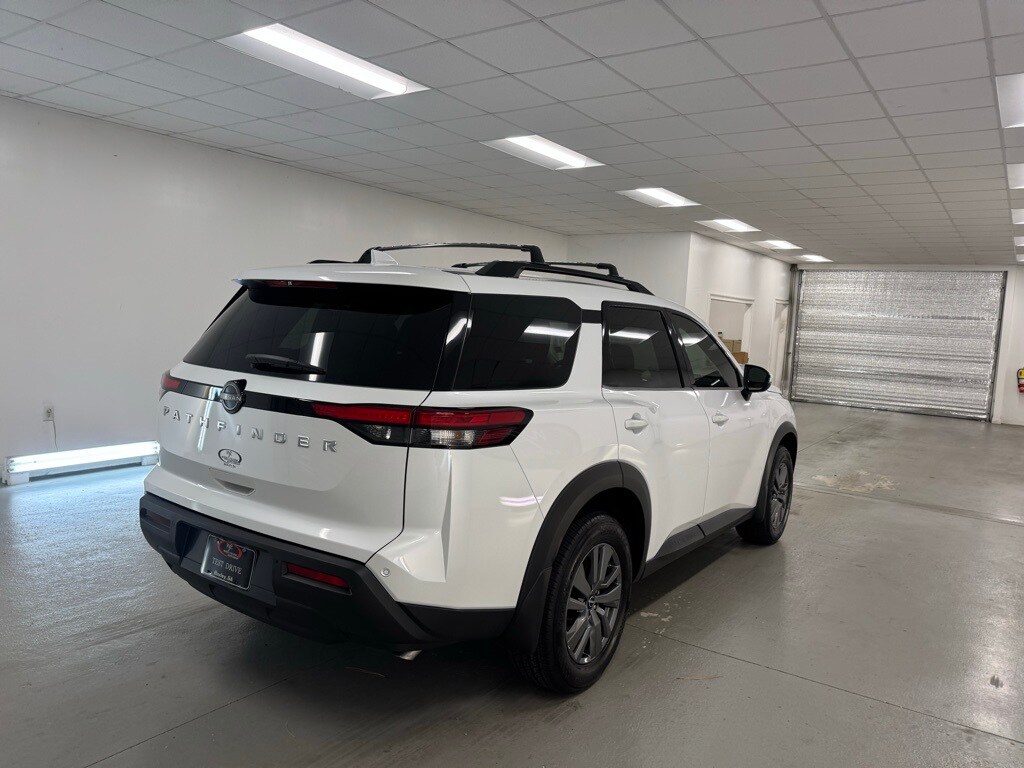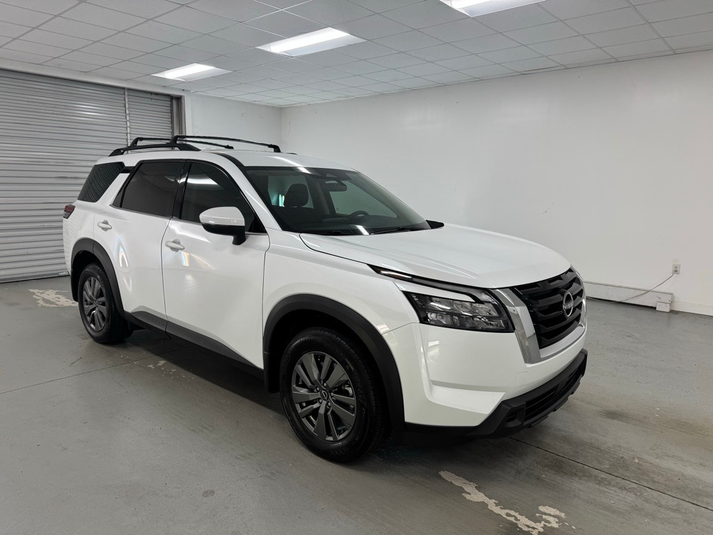 White Pearl 2025 Nissan Pathfinder SV FWD 9-Speed Automatic 3.5L V6 DOHC 3rd row seats: bench, 4-Wheel Disc Brakes, 6 Speakers, ABS brakes, Air Conditioning, Alloy wheels, AM/FM radio: SiriusXM, Auto High-beam Headlights, Automatic temperature control, Bench Seat Carpeted Floor Mats (Set of 4), Black Splash Guards (Set of 4), Brake assist, Bumpers: body-color, Cargo Area Protector, Cargo Net, Cargo Package, Cloth Seating Surfaces, Cross Bars, Delay-off headlights, Driver door bin, Driver vanity mirror, Dual front impact airbags, Dual front side impact airbags, Electronic Stability Control, Emergency communication system, First Aid, Four wheel independent suspension, Front anti-roll bar, Front Bucket Seats, Front Center Armrest, Front dual zone A/C, Front reading lights, Fully automatic headlights, Heated door mirrors, Heated Front Bucket Seats, Heated front seats, Illuminated entry, Knee airbag, Leather steering wheel, Low tire pressure warning, NissanConnect featuring Apple CarPlay and Android Auto, Occupant sensing airbag, Outside temperature display, Overhead airbag, Overhead console, Panic alarm, Passenger door bin, Passenger vanity mirror, Power door mirrors, Power driver seat, Power Liftgate, Power steering, Power windows, Radio data system, Radio: AM/FM Audio System w/NissanConnect, Rear air conditioning, Rear anti-roll bar, Rear Parking Sensors, Rear reading lights, Rear seat center armrest, Rear side impact airbag, Rear window defroster, Rear window wiper, Reclining 3rd row seat, Remote keyless entry, Security system, Speed control, Speed-sensing steering, Split folding rear seat, Spoiler, Steering wheel mounted audio controls, Tachometer, Telescoping steering wheel, Tilt steering wheel, Traction control, Trip computer, Turn signal indicator mirrors, Variably intermittent wipers, Wheels: 18" x 8J Painted Alloy.