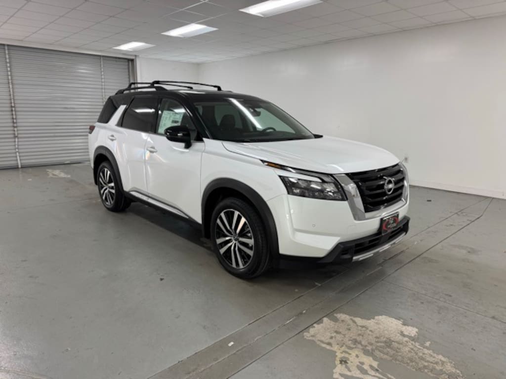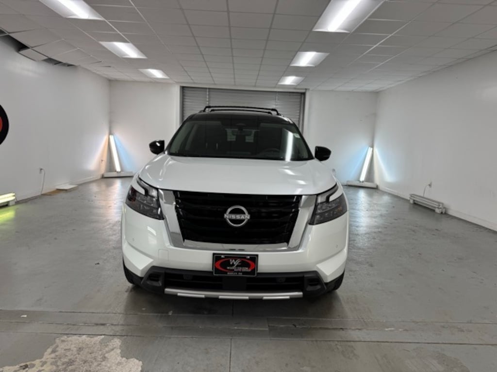 White Pearl 2025 Nissan Pathfinder Platinum FWD 9-Speed Automatic 3.5L V6 DOHC 13 Speakers, 3rd row seats: bench, 4-Wheel Disc Brakes, ABS brakes, Air Conditioning, Alloy wheels, AM/FM radio: SiriusXM, Auto High-beam Headlights, Auto tilt-away steering wheel, Auto-dimming Rear-View mirror, Automatic temperature control, Bodyside moldings, Bose Premium Audio System, Brake assist, Bumpers: body-color, Climate Controlled Front Bucket Seats, Delay-off headlights, Driver door bin, Driver vanity mirror, Dual front impact airbags, Dual front side impact airbags, Electronic Stability Control, Emergency communication system, Exterior Parking Camera Rear, Four wheel independent suspension, Front anti-roll bar, Front Bucket Seats, Front Center Armrest, Front dual zone A/C, Front reading lights, Fully automatic headlights, Garage door transmitter: HomeLink, Heads-Up Display, Heated door mirrors, Heated front seats, Heated rear seats, Heated steering wheel, Illuminated entry, Knee airbag, Leather steering wheel, Low tire pressure warning, Memory seat, Navigation system: NissanConnect with Navigation and Services, NissanConnect featuring Apple CarPlay and Android Auto, NissanConnect w/Navigation & Services, Occupant sensing airbag, Outside temperature display, Overhead airbag, Overhead console, Panic alarm, Passenger door bin, Passenger vanity mirror, Power door mirrors, Power driver seat, Power Liftgate, Power moonroof, Power passenger seat, Power steering, Power windows, Radio data system, Radio: AM/FM Audio System, Rain sensing wipers, Rear air conditioning, Rear anti-roll bar, Rear reading lights, Rear seat center armrest, Rear side impact airbag, Rear window defroster, Rear window wiper, Reclining 3rd row seat, Remote keyless entry, Security system, Semi-Aniline Leather-Appointed Seating Surfaces, Speed control, Speed-sensing steering, Speed-Sensitive Wipers, Split folding rear seat, Spoiler, Steering wheel memory, Steering wheel mounted audio controls, Tachometer, Telescoping steering wheel, Tilt steering wheel, Traction control, Trip computer, Turn signal indicator mirrors, Variably intermittent wipers, Ventilated front seats, Wheels: 20" x 8J Machined Alloy.