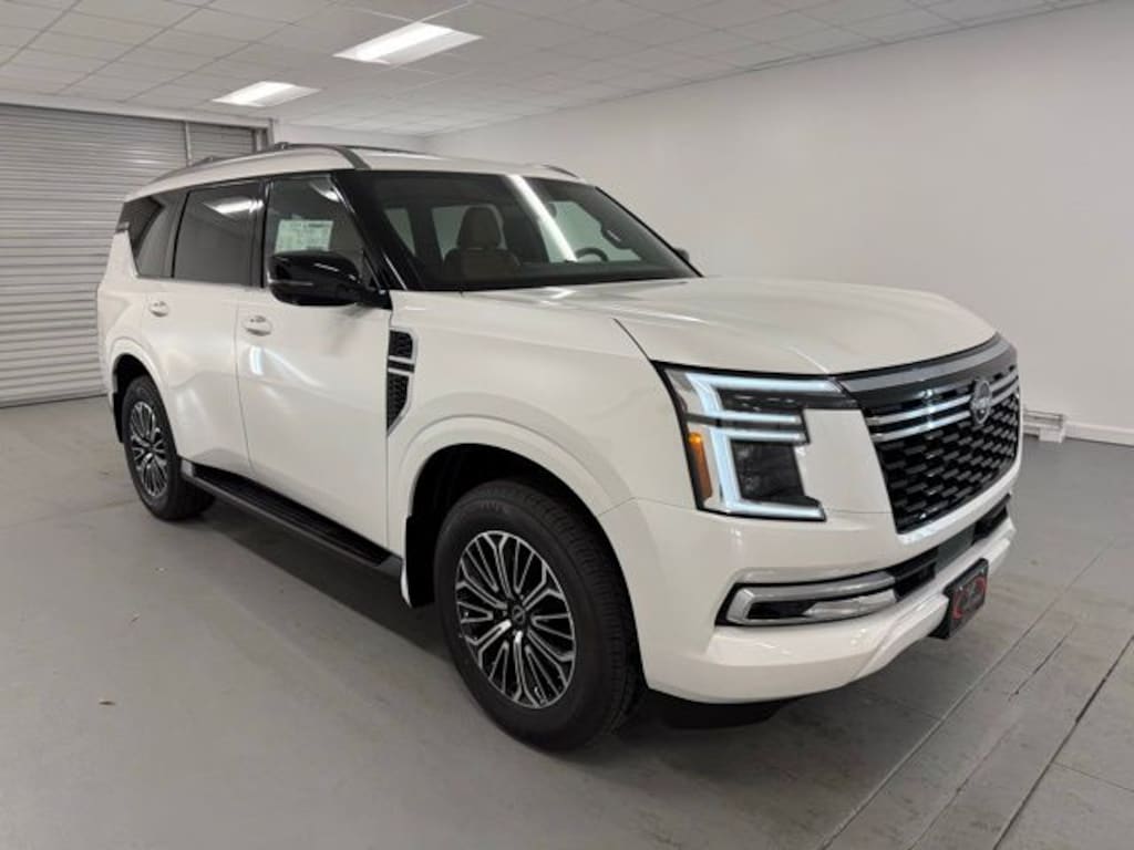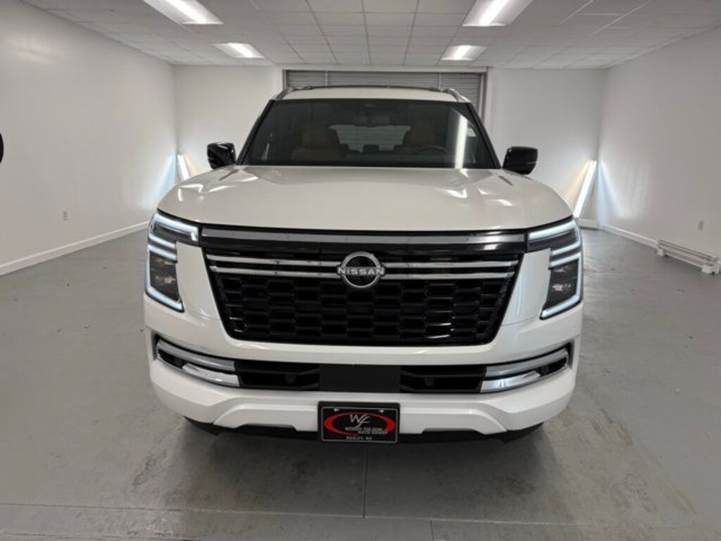 White 2026 Nissan Armada SL 4WD 9-Speed Automatic 3.5L DOHC 4WD, 12 Speakers, 3rd row seats: split-bench, 4-Wheel Disc Brakes, ABS brakes, Air Conditioning, Alloy wheels, AM/FM radio: SiriusXM w/360L, Anti-whiplash front head restraints, Apple CarPlay/Android Auto, Auto High-beam Headlights, Auto tilt-away steering wheel, Auto-dimming door mirrors, Auto-dimming Rear-View mirror, Auto-leveling suspension, Automatic temperature control, Brake assist, Bumpers: body-color, Center Front Spoiler, Compass, Delay-off headlights, Driver door bin, Driver vanity mirror, Dual front impact airbags, Dual front side impact airbags, Electronic Stability Control, Emergency communication system: NissanConnect Services, Four wheel independent suspension, Front anti-roll bar, Front Bucket Seats, Front Center Armrest, Front dual zone A/C, Front reading lights, Fully automatic headlights, Garage door transmitter: myQ Connected Garage, Genuine wood dashboard insert, Heated door mirrors, Heated Front Bucket Seats, Heated front seats, Heated steering wheel, HVAC memory, Illuminated entry, Knee airbag, Leather steering wheel, Low tire pressure warning, Memory seat, Navigation system: Google Maps, Occupant sensing airbag, Outside temperature display, Overhead airbag, Overhead console, Panic alarm, Passenger door bin, Passenger vanity mirror, Power door mirrors, Power driver seat, Power Liftgate, Power passenger seat, Power steering, Power windows, Premium Paint, Radio: NissanConnect with SiriusXM 360L, Rain sensing wipers, Rear air conditioning, Rear anti-roll bar, Rear reading lights, Rear seat center armrest, Rear window defroster, Rear window wiper, Reclining 3rd row seat, Remote keyless entry, Security system, Speed control, Speed-sensing steering, Speed-Sensitive Wipers, Split folding rear seat, Spoiler, Steering wheel memory, Steering wheel mounted audio controls, Tachometer, TailorFit Seat Trim, Telescoping steering wheel, Tilt steering wheel, Traction control, Trip computer, Turn signal indicator mirrors, Variably intermittent wipers, Voltmeter, Wheels: 20" x 8.5J Machined and Painted Alloy, 4WD.