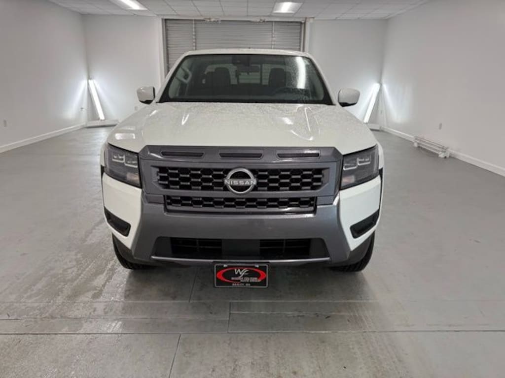 Glacier White 2026 Nissan Frontier SV RWD 9-Speed Automatic with Overdrive 3.8L DI DOHC 24V V6 17" Alloy Wheels, 3.692 Axle Ratio, 4-Wheel Disc Brakes, 6 Speakers, ABS brakes, Air Conditioning, Alloy wheels, AM/FM radio: SiriusXM, Anti-whiplash front head restraints, Auto High-beam Headlights, Blind Spot Warning, Brake assist, Bumpers: body-color, Delay-off headlights, Driver door bin, Driver vanity mirror, Dual front impact airbags, Dual front side impact airbags, Electronic Stability Control, Emergency communication system, Front anti-roll bar, Front Bucket Seats, Front Center Armrest, Front reading lights, Front wheel independent suspension, Fully automatic headlights, Illuminated entry, Knee airbag, Low tire pressure warning, Occupant sensing airbag, Overhead airbag, Overhead console, Panic alarm, Passenger door bin, Passenger vanity mirror, Power door mirrors, Power driver seat, Power steering, Power windows, Premium Cloth Seat Trim, Radio data system, Radio: SXM/AM/FM/AUX/USB Audio System, Rear anti-roll bar, Rear seat center armrest, Rear side impact airbag, Rear step bumper, Remote keyless entry, Security system, Speed control, Speed-sensing steering, Split folding rear seat, Steering wheel mounted audio controls, Tachometer, Telescoping steering wheel, Tilt steering wheel, Tow/Haul Mode Switch, Traction control, Trip computer, Variably intermittent wipers, Voltmeter, Wireless Apple CarPlay/Wireless Android Auto.