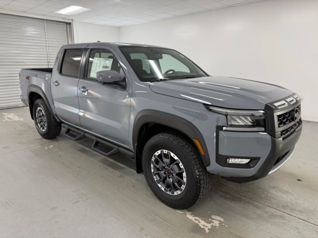 Gray 2026 Nissan Frontier PRO-4X 4WD 9-Speed Automatic with Overdrive 3.8L DI DOHC 24V V6 4WD, 17" Painted Alloy Wheels, 3.692 Axle Ratio, 4-Wheel Disc Brakes, 6 Speakers, ABS brakes, Air Conditioning, Alloy wheels, AM/FM radio: SiriusXM, Anti-whiplash front head restraints, Auto High-beam Headlights, Automatic temperature control, Blind Spot Warning, Brake assist, Bumpers: body-color, Delay-off headlights, Driver door bin, Driver vanity mirror, Dual front impact airbags, Dual front side impact airbags, Electronic Stability Control, Emergency communication system, Front anti-roll bar, Front Bucket Seats, Front Center Armrest, Front dual zone A/C, Front fog lights, Front reading lights, Front wheel independent suspension, Fully automatic headlights, Heated Front Bucket Seats, Illuminated entry, Knee airbag, Leather steering wheel, Low tire pressure warning, Occupant sensing airbag, Overhead airbag, Overhead console, Panic alarm, Passenger door bin, Passenger vanity mirror, Power door mirrors, Power driver seat, Power passenger seat, Power steering, Power windows, PRO Embroidered Premium Cloth Seat Trim, Radio data system, Radio: SXM/AM/FM/AUX/USB Audio System, Rear anti-roll bar, Rear seat center armrest, Rear side impact airbag, Rear step bumper, Remote keyless entry, Security system, Speed control, Speed-sensing steering, Split folding rear seat, Steering wheel mounted audio controls, Tachometer, Telescoping steering wheel, Tilt steering wheel, Traction control, Trip computer, Variably intermittent wipers, Voltmeter, Wireless Apple CarPlay/Wireless Android Auto, 4WD.