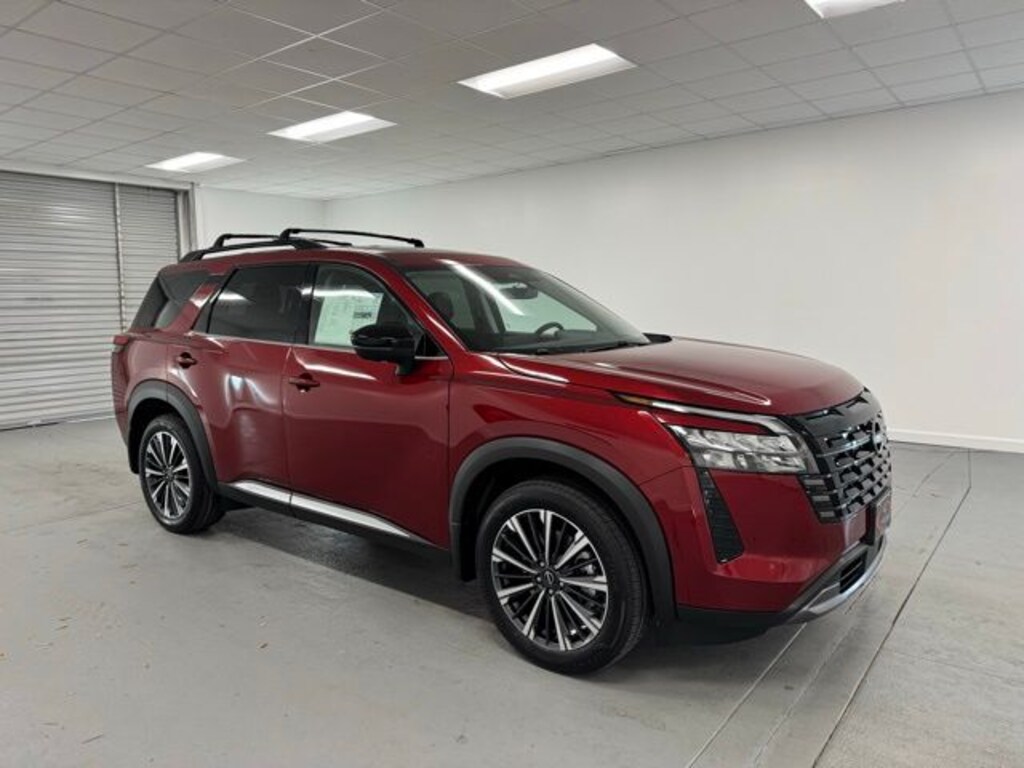 Scarlet 2026 Nissan Pathfinder Platinum FWD 9-Speed Automatic 3.5L V6 DOHC 13 Speakers, 3rd row seats: bench, 4-Wheel Disc Brakes, ABS brakes, Air Conditioning, Alloy wheels, AM/FM radio: SiriusXM w/360L, Auto High-beam Headlights, Auto tilt-away steering wheel, Auto-dimming Rear-View mirror, Automatic temperature control, Bodyside moldings, Bose Premium Audio System, Brake assist, Bumpers: body-color, Climate Controlled Front Bucket Seats, Delay-off headlights, Driver door bin, Driver vanity mirror, Dual front impact airbags, Dual front side impact airbags, Electronic Stability Control, Emergency communication system: NissanConnect Services, Four wheel independent suspension, Front anti-roll bar, Front Bucket Seats, Front Center Armrest, Front dual zone A/C, Front reading lights, Fully automatic headlights, Garage door transmitter: HomeLink, Heads-Up Display, Heated door mirrors, Heated front seats, Heated rear seats, Heated steering wheel, Illuminated entry, Knee airbag, Low tire pressure warning, Memory seat, Navigation System, NissanConnect featuring Apple CarPlay and Android Auto, Occupant sensing airbag, Outside temperature display, Overhead airbag, Overhead console, Panic alarm, Passenger door bin, Passenger vanity mirror, Power door mirrors, Power driver seat, Power Liftgate, Power moonroof, Power passenger seat, Power steering, Power windows, Premium Paint, Radio data system, Radio: AM/FM Audio System with NissanConnect, Rain sensing wipers, Rear air conditioning, Rear anti-roll bar, Rear reading lights, Rear seat center armrest, Rear side impact airbag, Rear window defroster, Rear window wiper, Reclining 3rd row seat, Remote keyless entry, Security system, Semi-Aniline Leather-Appointed Seating Surfaces, Speed control, Speed-sensing steering, Speed-Sensitive Wipers, Split folding rear seat, Spoiler, Steering wheel memory, Steering wheel mounted audio controls, Tachometer, Telescoping steering wheel, Tilt steering wheel, Traction control, Trip computer, Turn signal indicator mirrors, Variably intermittent wipers, Ventilated front seats, Wheels: 20" Machined Alloy.