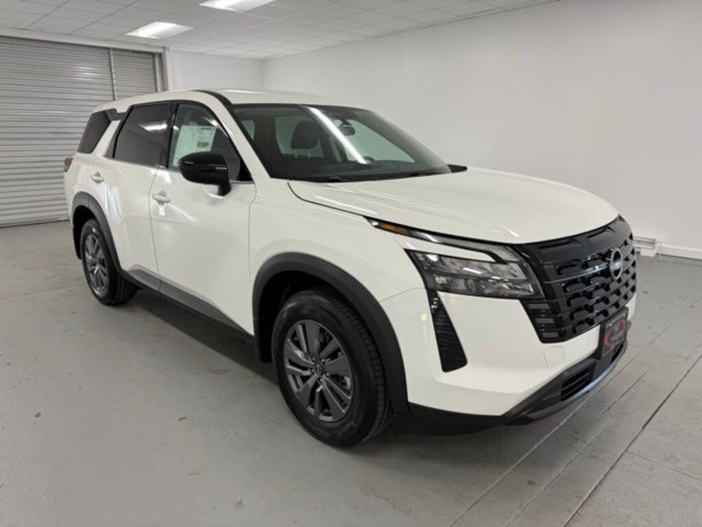Glacier White 2026 Nissan Pathfinder S FWD 9-Speed Automatic 3.5L V6 DOHC 18" Painted Alloy Wheels, 3rd row seats: bench, 4-Wheel Disc Brakes, 6 Speakers, ABS brakes, Air Conditioning, Alloy wheels, AM/FM radio: SiriusXM w/360L, Auto High-beam Headlights, Automatic temperature control, Blind Spot Warning, Brake assist, Bumpers: body-color, Cloth Seating Surfaces, Delay-off headlights, Driver door bin, Driver vanity mirror, Dual front impact airbags, Dual front side impact airbags, Electronic Stability Control, Emergency communication system: NissanConnect Services, Four wheel independent suspension, Front anti-roll bar, Front Bucket Seats, Front Center Armrest, Front dual zone A/C, Front reading lights, Fully automatic headlights, Garage door transmitter: myQ Connected Garage, Illuminated entry, Knee airbag, Low tire pressure warning, NissanConnect featuring Apple CarPlay and Android Auto, Occupant sensing airbag, Outside temperature display, Overhead airbag, Overhead console, Panic alarm, Passenger door bin, Passenger vanity mirror, Power door mirrors, Power steering, Power windows, Radio data system, Radio: AM/FM Audio System with NissanConnect, Rear air conditioning, Rear anti-roll bar, Rear reading lights, Rear side impact airbag, Rear window defroster, Rear window wiper, Reclining 3rd row seat, Remote keyless entry, Security system, Speed control, Speed-sensing steering, Split folding rear seat, Spoiler, Steering wheel mounted audio controls, Tachometer, Telescoping steering wheel, Tilt steering wheel, Traction control, Trip computer, Variably intermittent wipers.